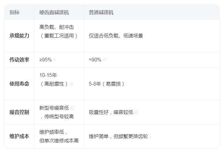 硬齒面減速機與普通減速機(通常指軟齒面減速機)的核心區別主要體現在齒輪材料、工藝、性能及應用場景等方面,具體差異如下: